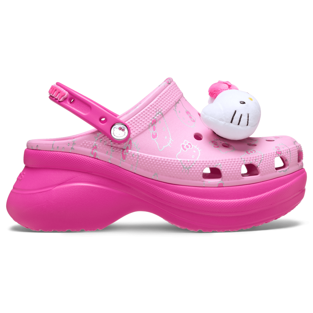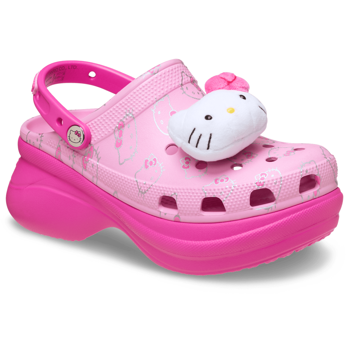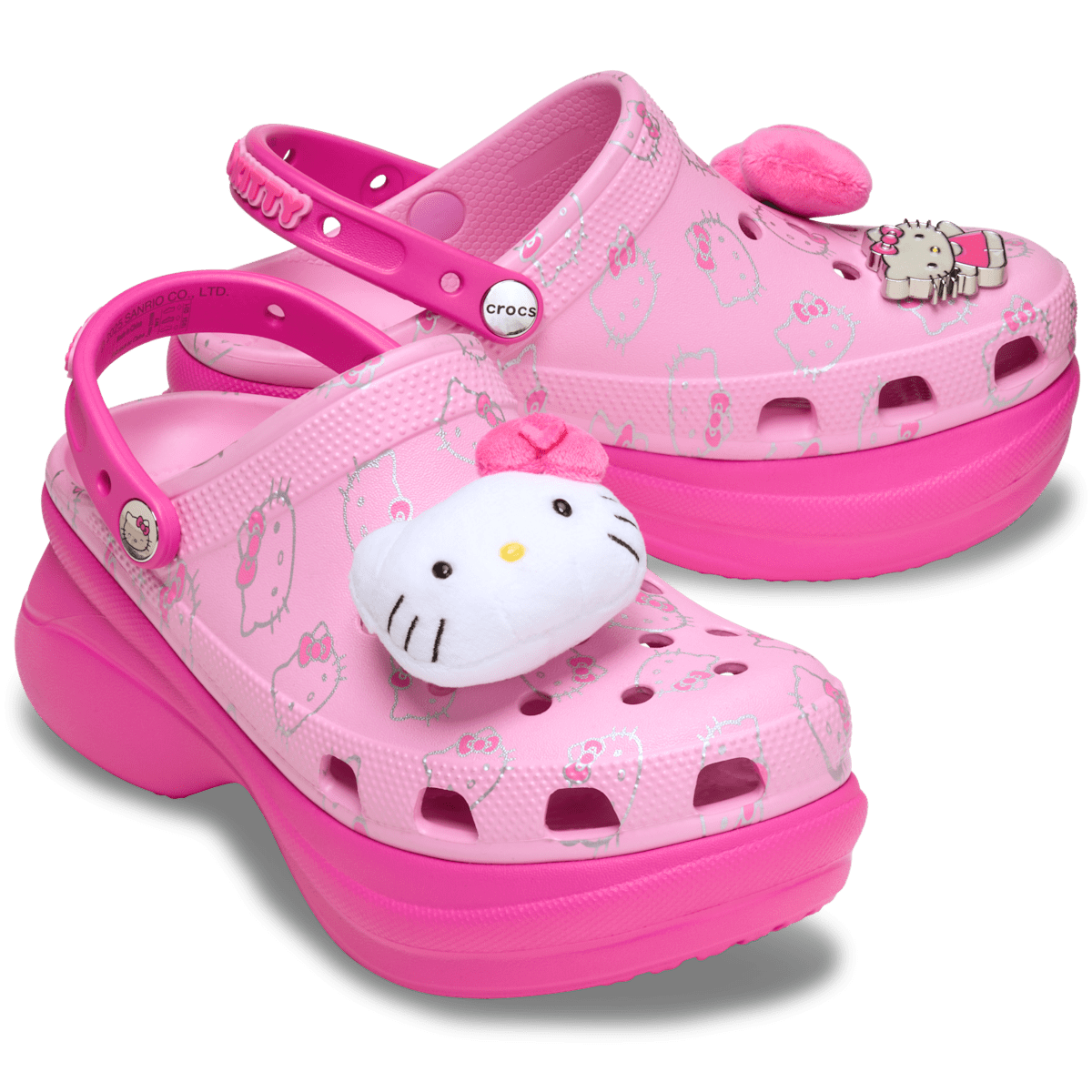 Step up your cute game with Hello Kitty® on the Bae Clog — the ultimate combo of sweet and elevated style. Featuring plush Hello Kitty Jibbitz™ charms, soft pink tones, and an all-over character print, this height-boosted silhouette brings bold energy to every step. With extra cushioning, a chunky platform, and serious charm, it’s a look that says adorable — with attitude.