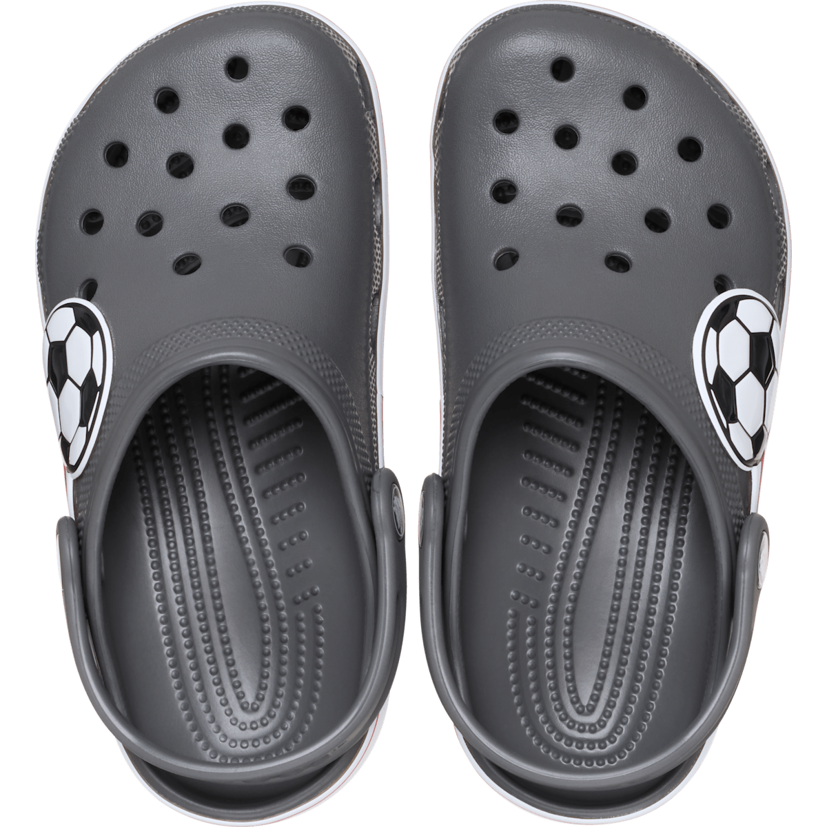 This sporty version of the Classic Clog features a band with a textured design of a flaming soccer ball. The unique band helps kids show off their love of soccer, and Crosliteâ„¢ foam construction keeps them light and easy to wear. Grounded in comfort, spiked with personality.