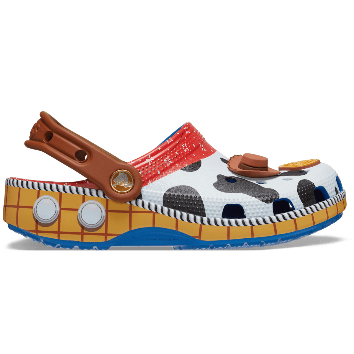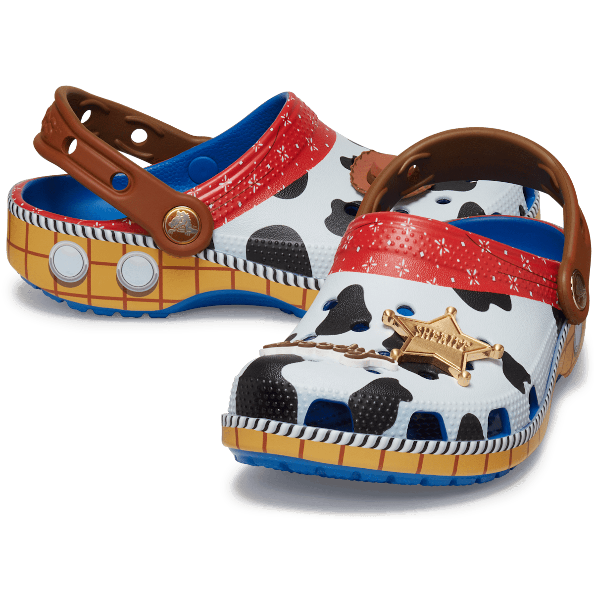 Shake out the snake in your boot, Sheriff Woody makes his debut as a Classic Clog! This exclusive design features a wrapped print reminiscent of Woody’s iconic plaid shirt and cow print vest, topped with four exclusive Jibbitz™ charms. These clogs also feature the beloved “Andy” signature on the inside sole.