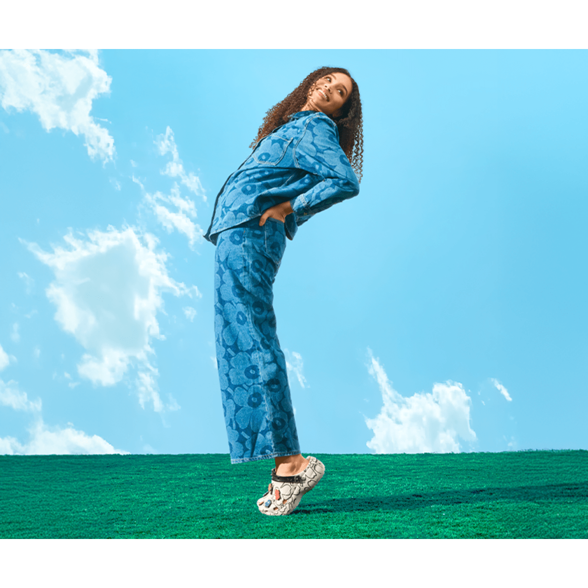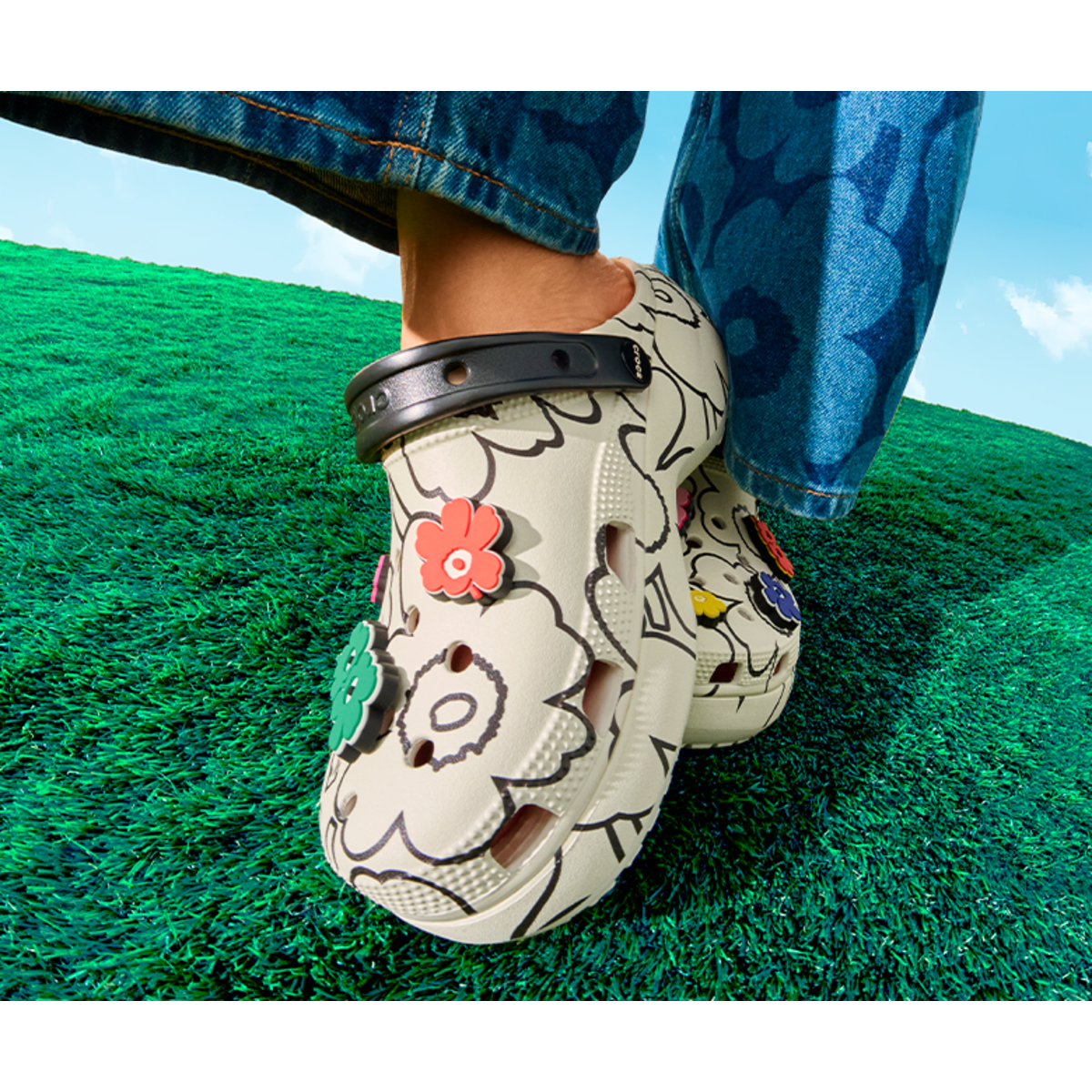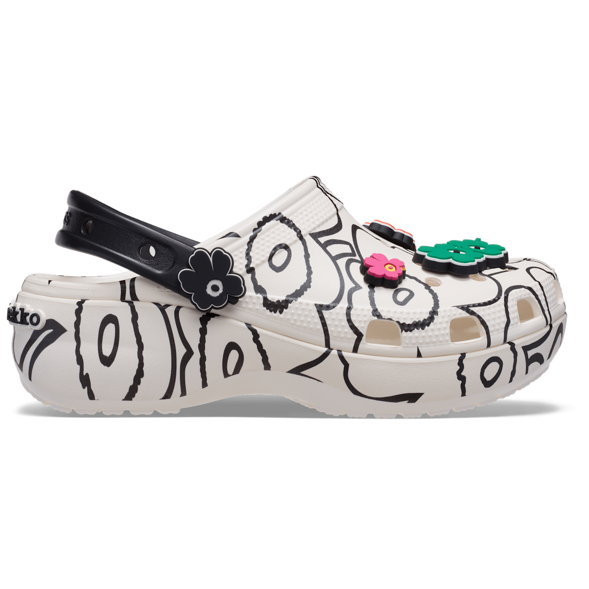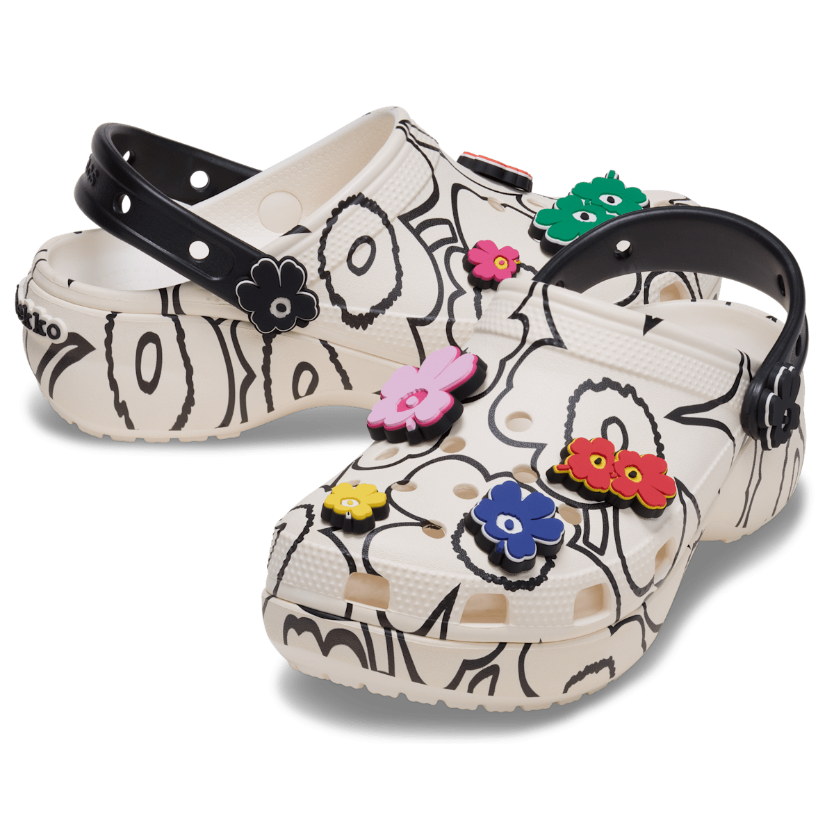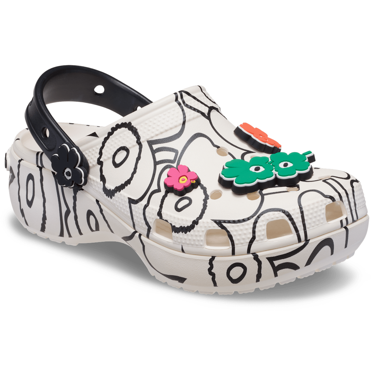 Anything but ordinary, the Marimekko x Crocs Classic Platform Clog features a black and white palette with an all-over Unikko print created by Maija Isola in 1964. Pops of color bloom with an assortment of exclusive Jibbitz™ charms and plenty of space for personalization. Dimensional Unikko floral rivets and a Marimekko stamped logo on the footbed bring the brand’s heritage marks to this elevated trend-forward platform style.