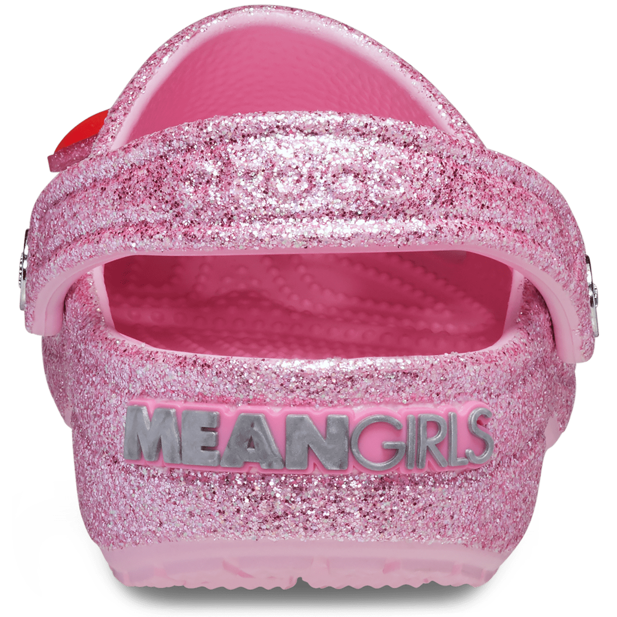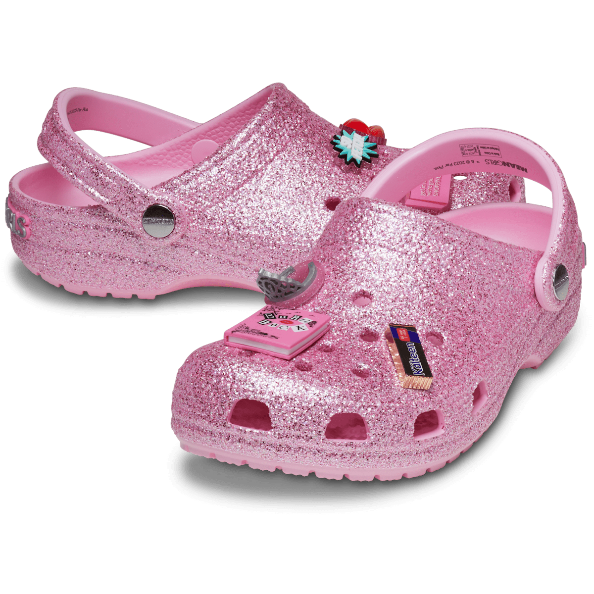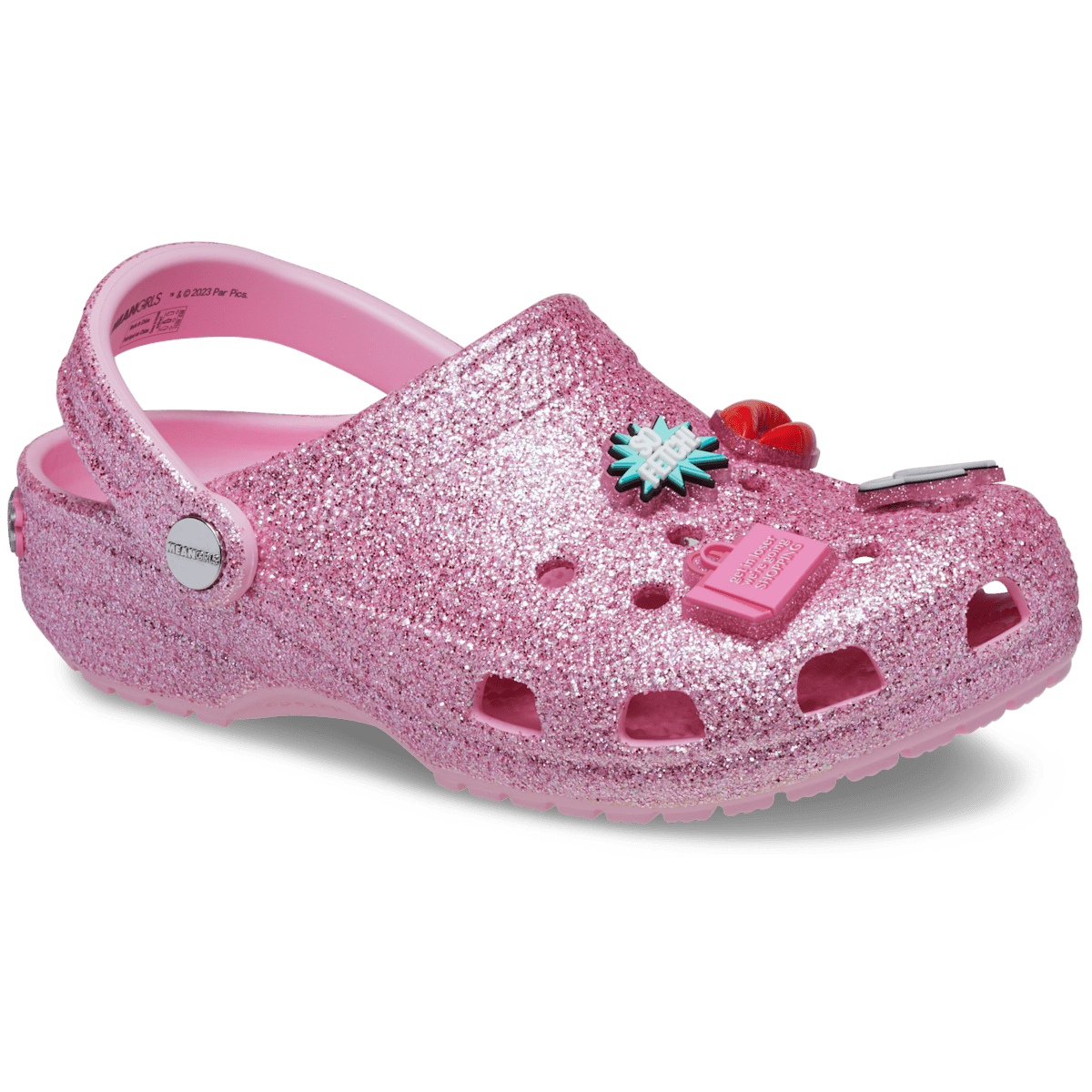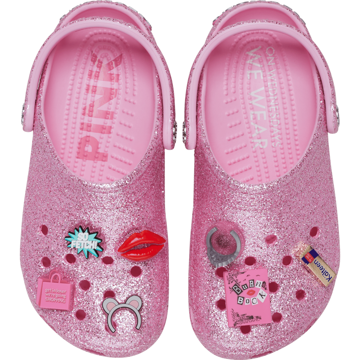 On Wednesdays we wear the new pink Mean Girls Classic Clog. This glittery silhouette features a dazzling Mean Girls insignia on the heel for some extra glamour. Regulation hotties will love the exclusive Jibbitz™ charms featuring the Burn Book, Kälteen Bar, mouse ears and more fan-favorite moments from the iconic film. All the style of the Plastics with classic Crocs comfort.