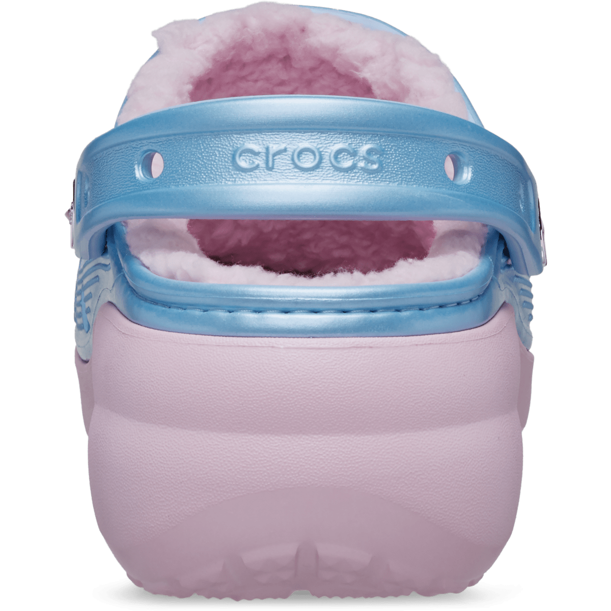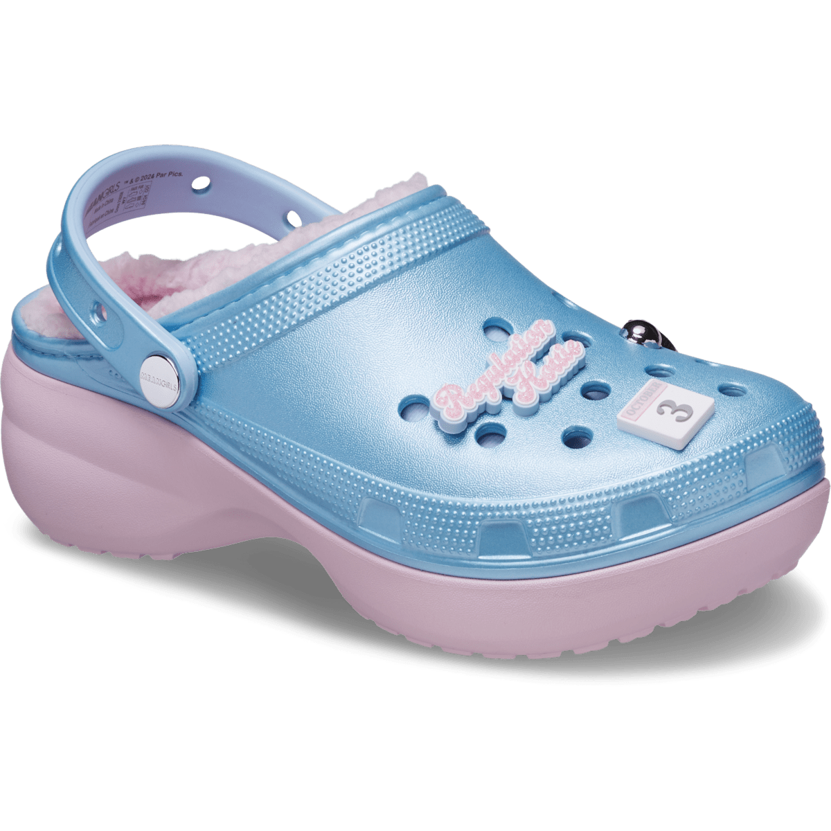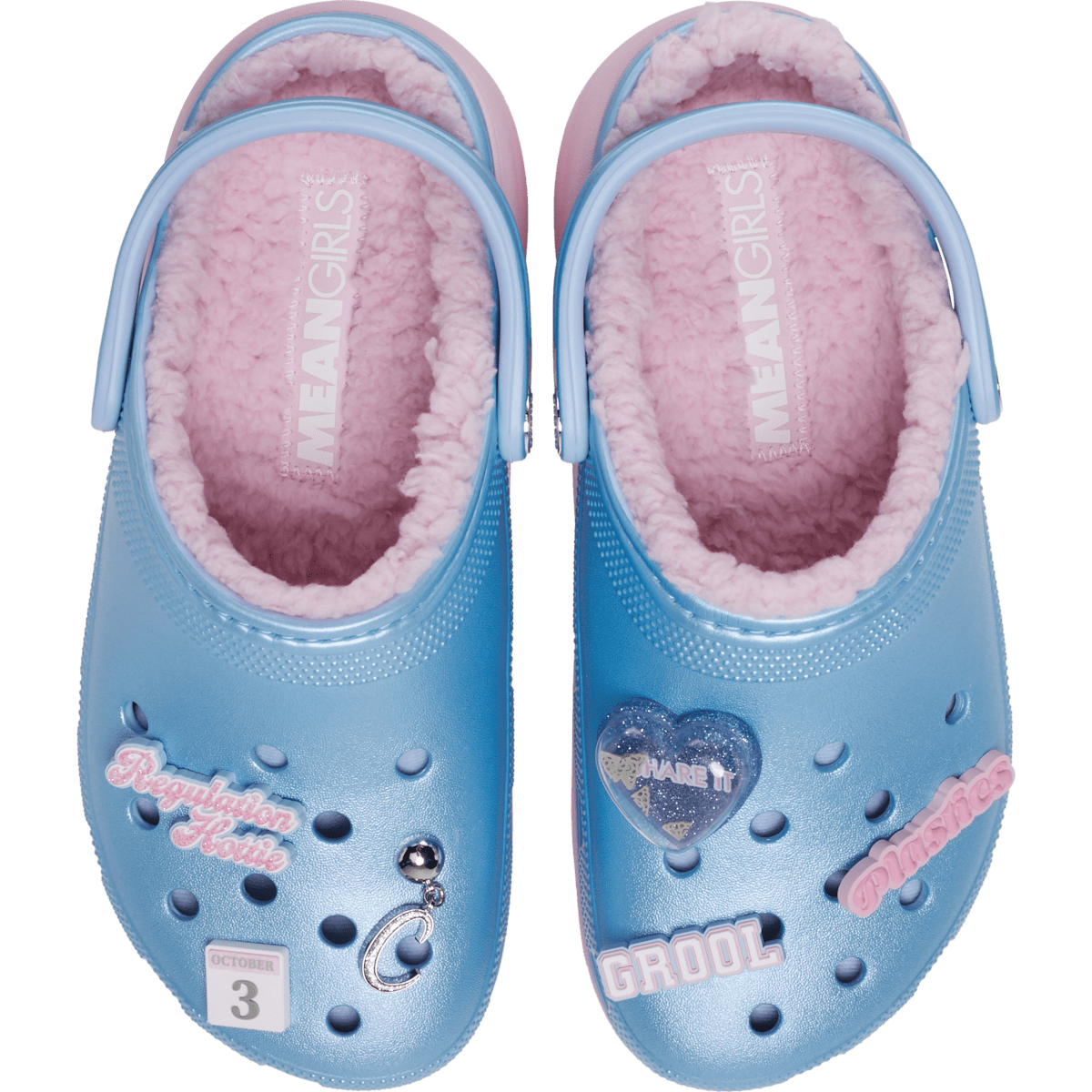 The Mean Girls Classic Platform Clogs are like really pretty with a shimmering blue upper and pink sole. The elevated platform sole adds height that is a little bit dramatic with a soft, fuzzy interior lining. This exclusive design is topped with themed Jibbitz™ charms including “Regulation Hottie” and “Grool” for fans who love the quote-worthy cult classic.