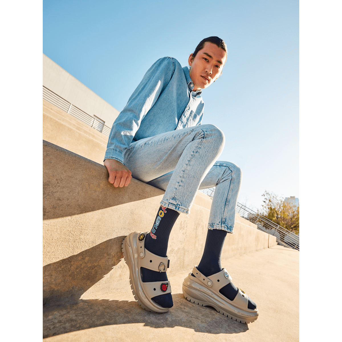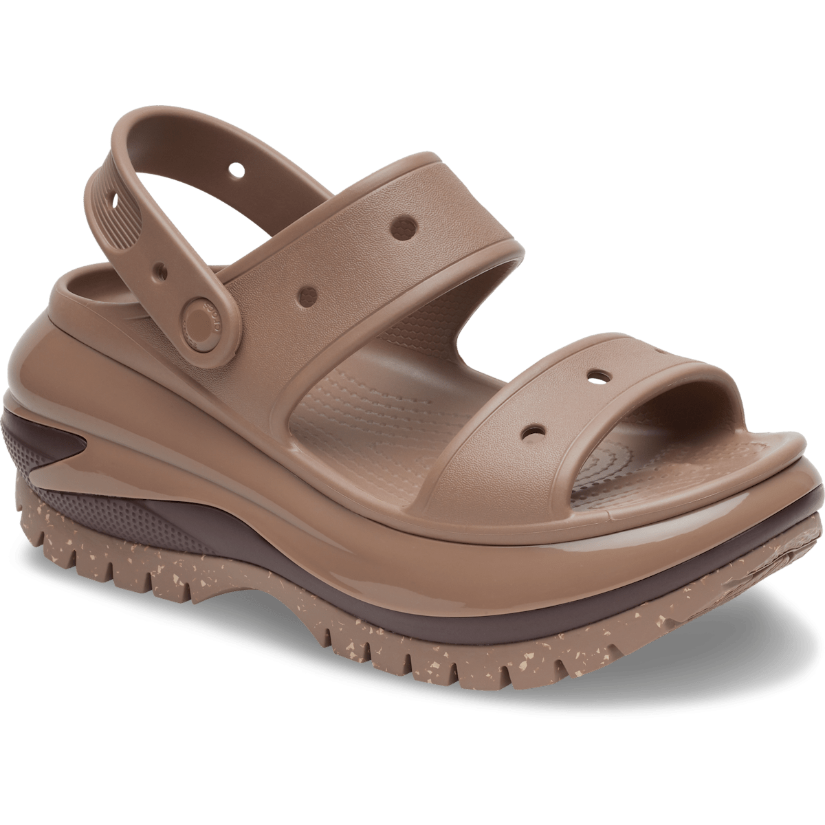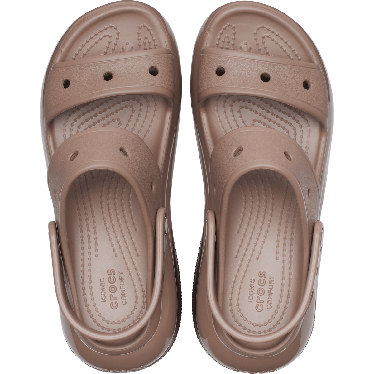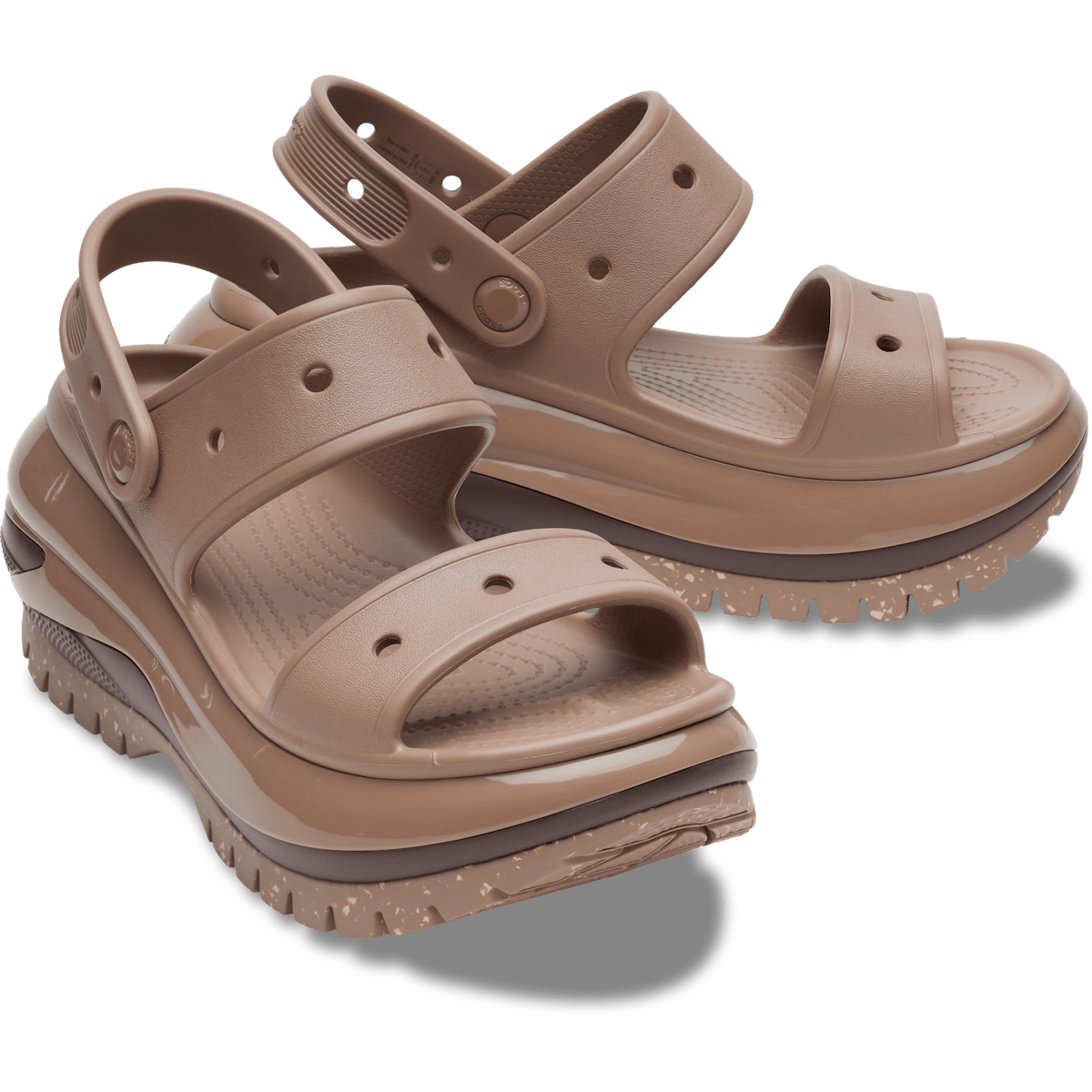 The look and feel of our Classic Mega Crush Clog is now available in sandal form. Introducing the Classic Mega Crush Sandal, featuring an enhanced rubber tread, updated detailing around the outsole and a platform ready to take any outfit to the next level. A two-strap upper and secure backstrap help ensure a secure fit, while boasting holes for personalization with Jibbitzâ„¢ charms. Are you ready for your new crush?