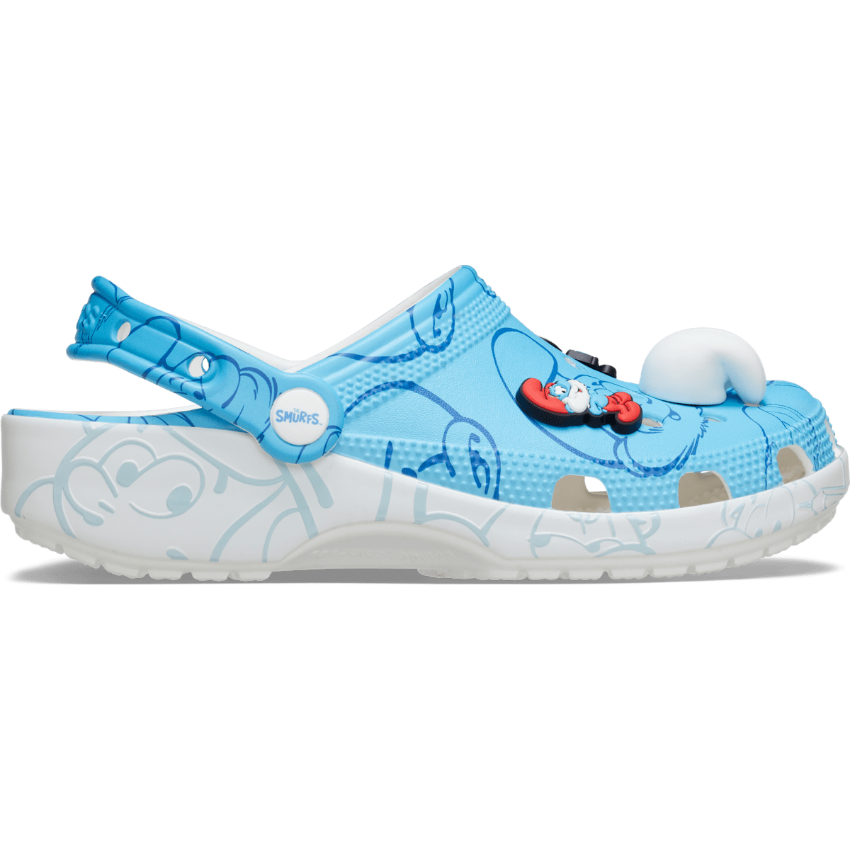 The Smurfs Classic Clog is so smurfing cute. With an allover Smurfs print on the true blue upper. And even more Smurf style with exclusive Jibbitzâ„¢ charms that include a 3D hat, mushroom and favorite characters.