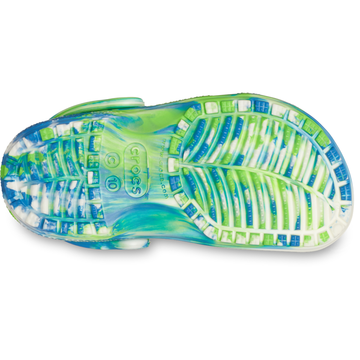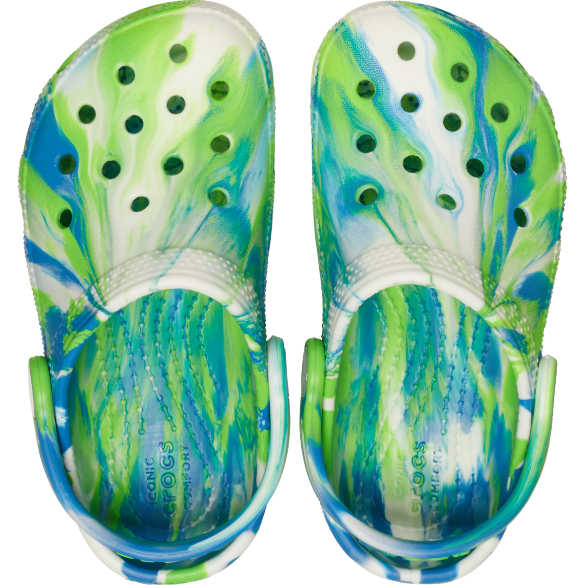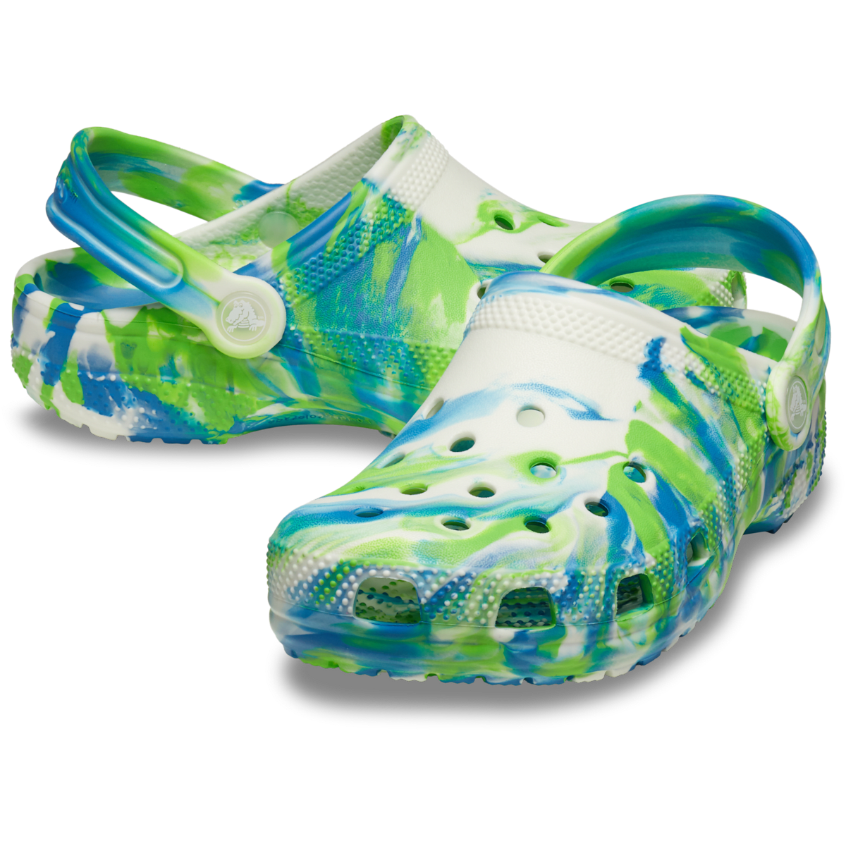 This version of the iconic clog features the new glow-in-the-dark version of the popular marbled treatment, helping kids show off their fun and creative spirit. This new marbled Crosliteâ„¢ material creates a colorful glow-in-the-dark effect that is completely unique. While all marbled shoes have the same wavy look, no two shoes are exactly alike. Crocs offers a variety of Classic Clogs for Kids and Toddlers that feature inspired designs to help kids express themselves and engage new friends, resulting in more fun for the little ones.