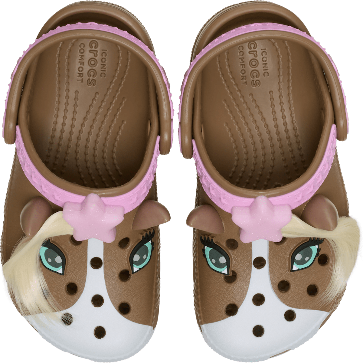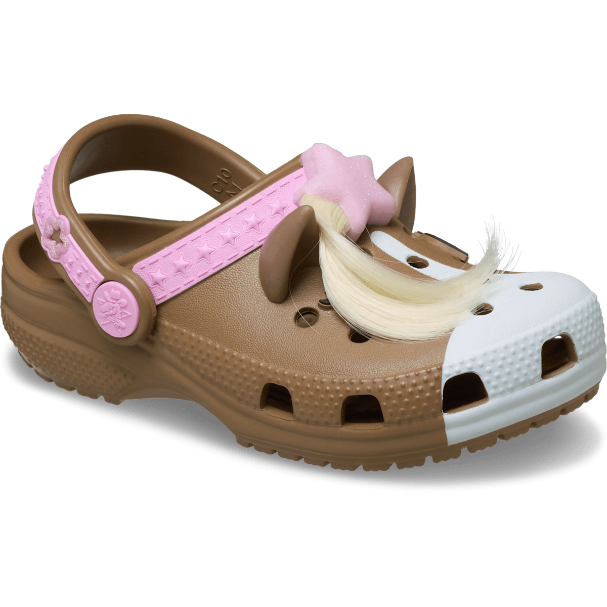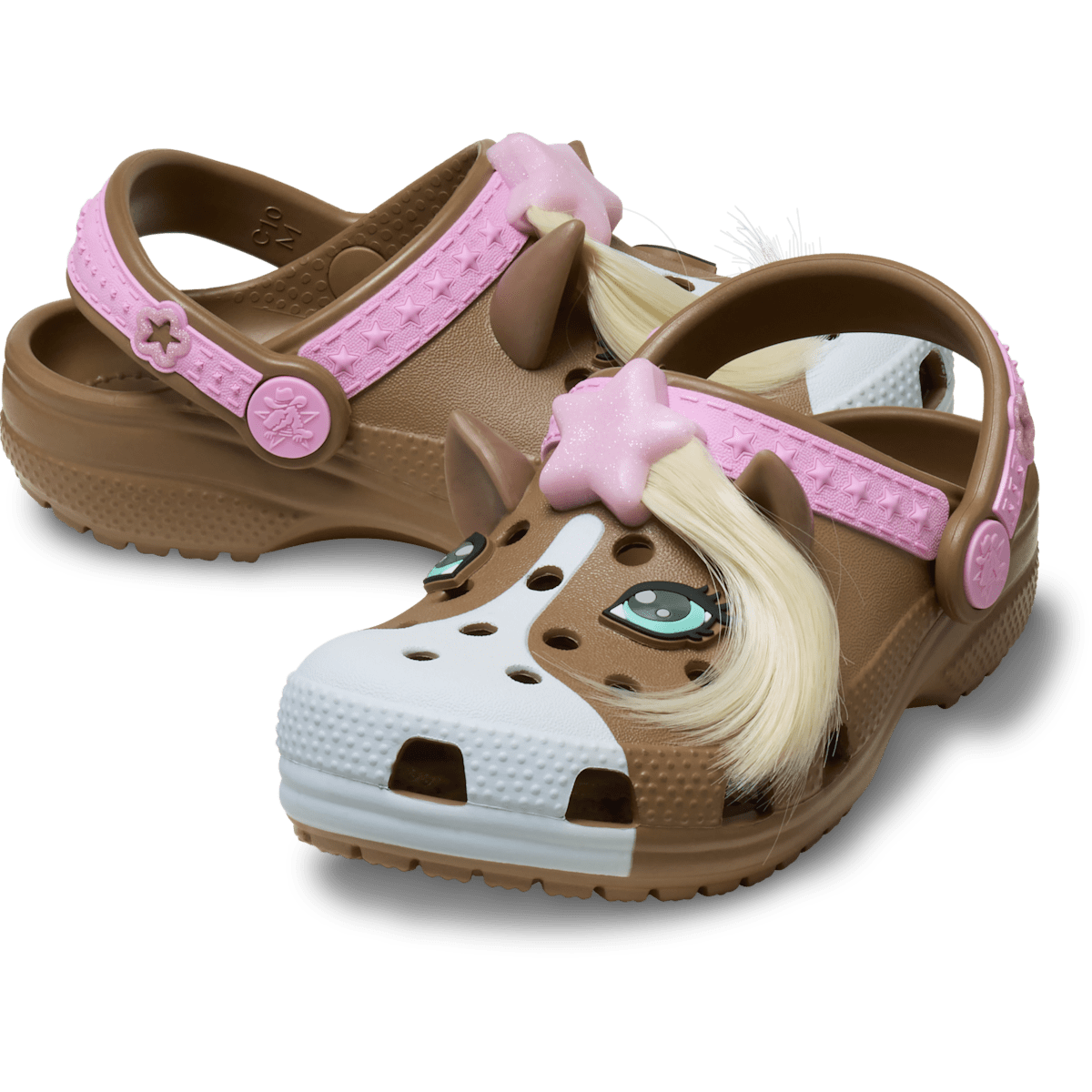 Know a little one who loves horses? Well, “giddy-up” and get ready for the ride of a lifetime! The fun horse-inspired design on these clogs will help your little one show off their love for horses, or even allow them to pretend like they are a horse, when they put on these shoes. The unique design includes fixed horse ears, eyes and tail embellishments, as well as a harness embellishment on the upper and backstrap. Crocs offers a variety of Classic Clogs for Kids and Toddlers that feature original character-rich graphics and other inspired designs to help kids express themselves and engage new friends, resulting in more fun for the little ones.