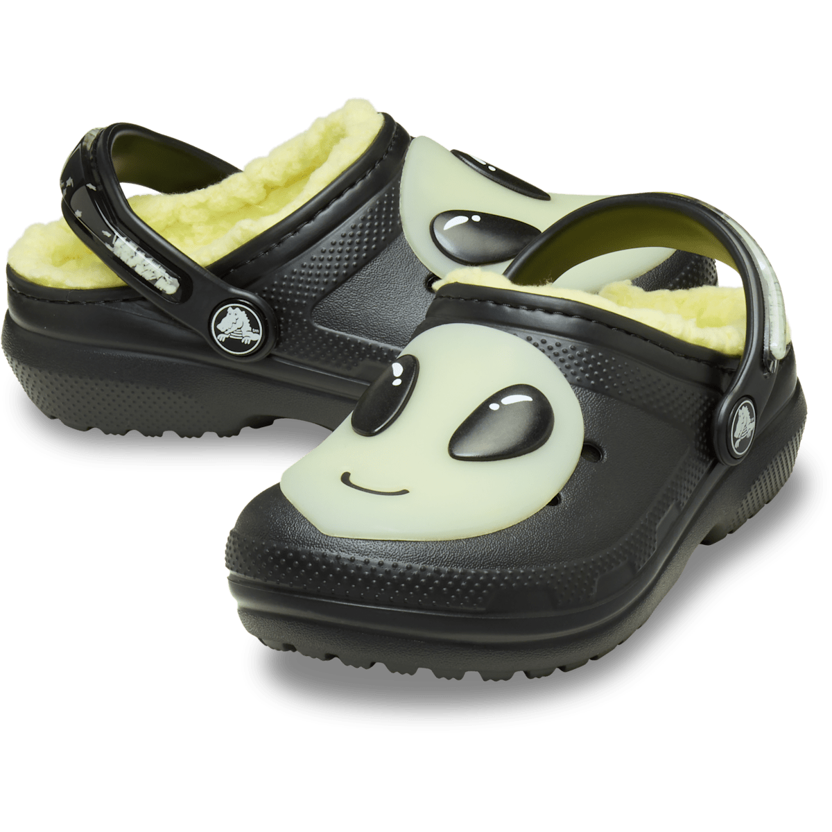 Great for little ones who are fascinated with aliens, this version of the iconic clog features an oversized glow-in-the-dark alien embellishment, plus a unique patch on the backstrap filled with shakable glitter. The warm, fuzzy liner adds to the cushion and comfort, and Crosliteâ„¢ foam construction keeps them light and easy to wear. Crocs offers a variety of Classic Clogs for Kids and Toddlers that feature inspired designs to help kids express themselves and engage new friends, resulting in more fun.