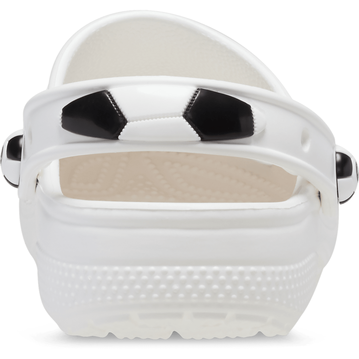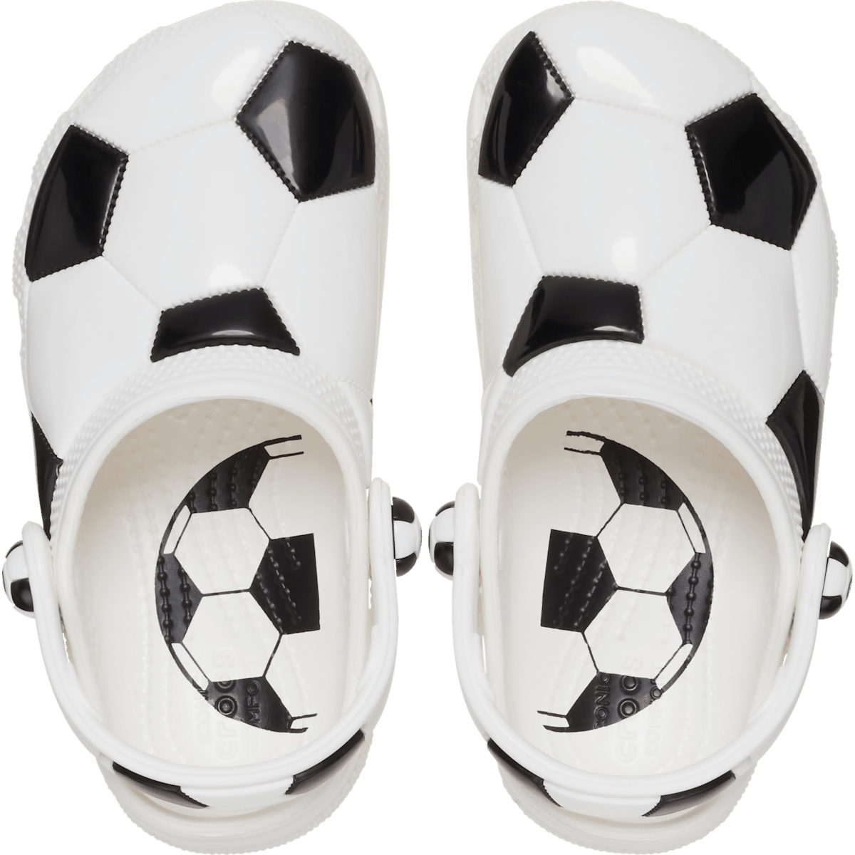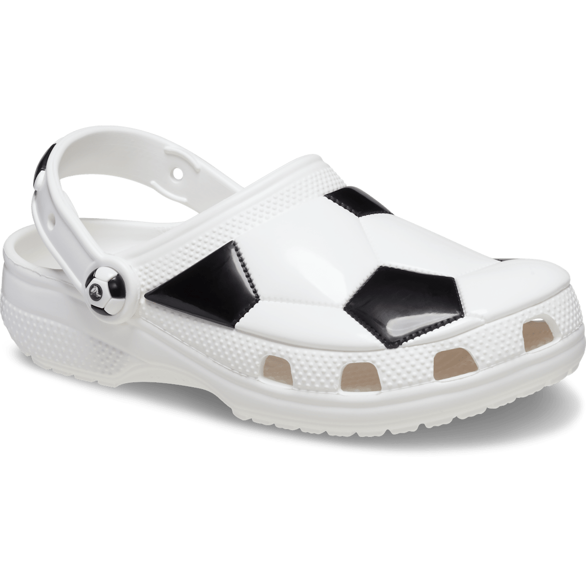 This version of the iconic clog is specially designed for young soccer fans. Featuring a unique upper inspired by the iconic black and white soccer ball design, and soccer ball inspired rivets and fixed patch on the backstrap, these clogs will help little ones show off their love of soccer. Plus, a soccer ball puzzle graphic on the insoles helps little ones put the shoe on the correct foot. Crocs offers a variety of Classic Clogs for Kids and Toddlers that feature original character-rich graphics and other inspired designs to help kids express themselves and engage new friends, resulting in more fun for the little ones.