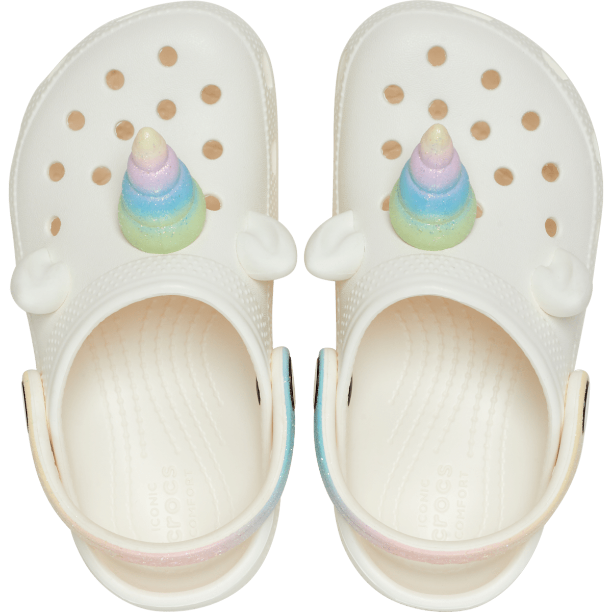 These clogs are perfect for little ones that love unicorns and rainbows. Featuring a fixed rainbow unicorn horn and ears on each shoe, your little ones can show off their love for unicorns, or even pretend like they become a unicorn, when they put on these shoes. Crocs offers a variety of Classic Clogs for Kids and Toddlers that feature original character-rich graphics and other inspired designs to help kids express themselves and engage new friends, resulting in more fun for the little ones.