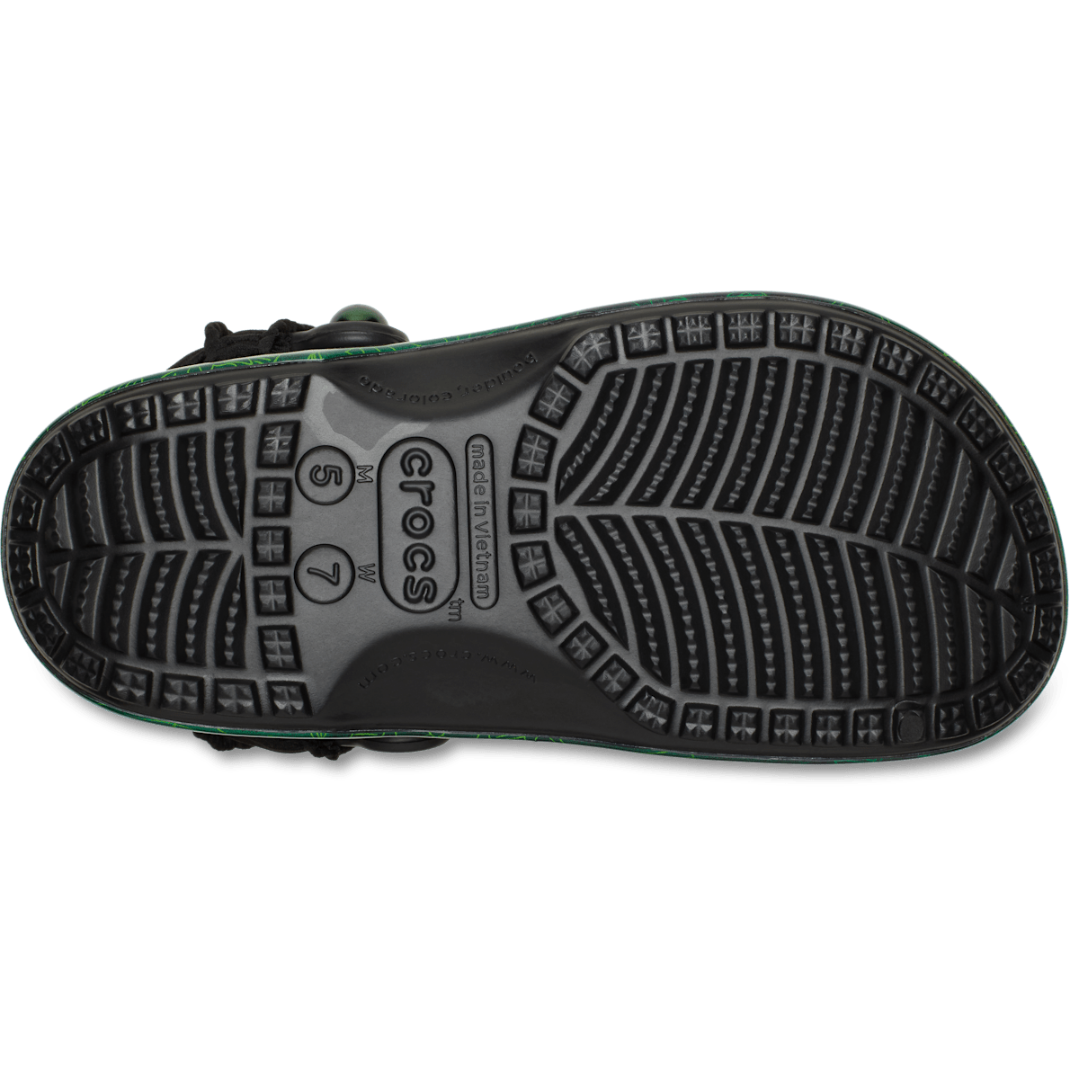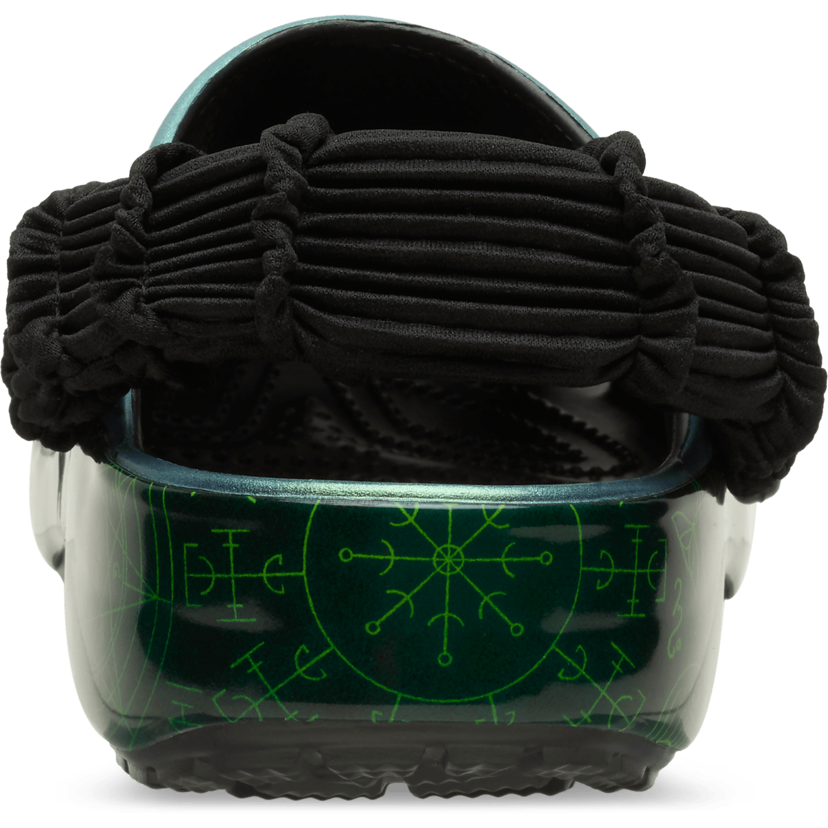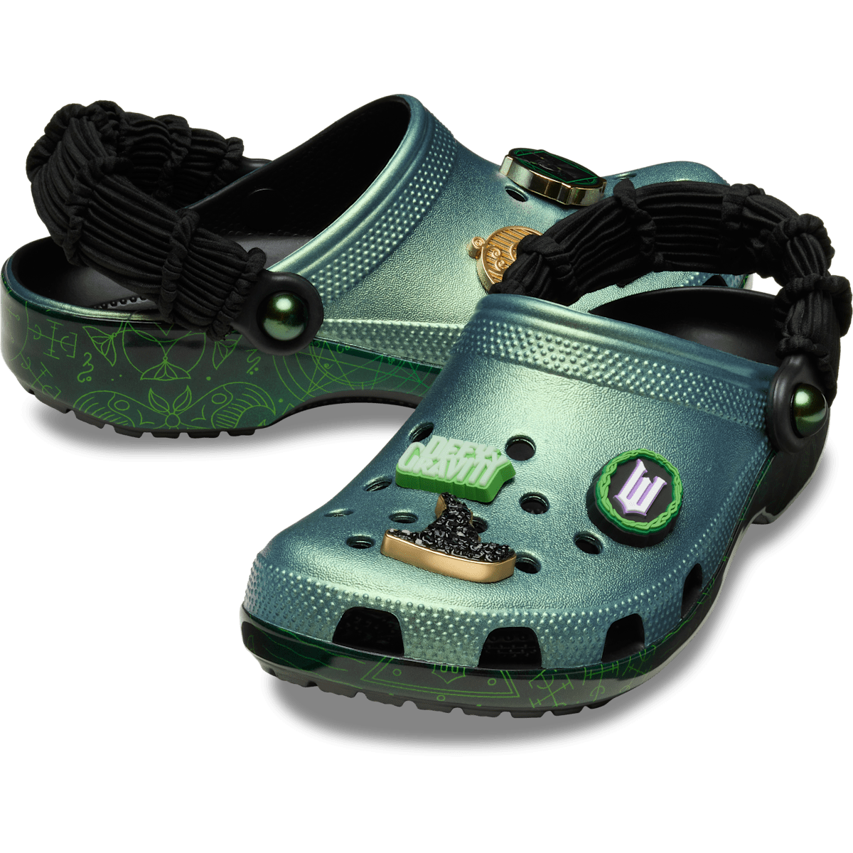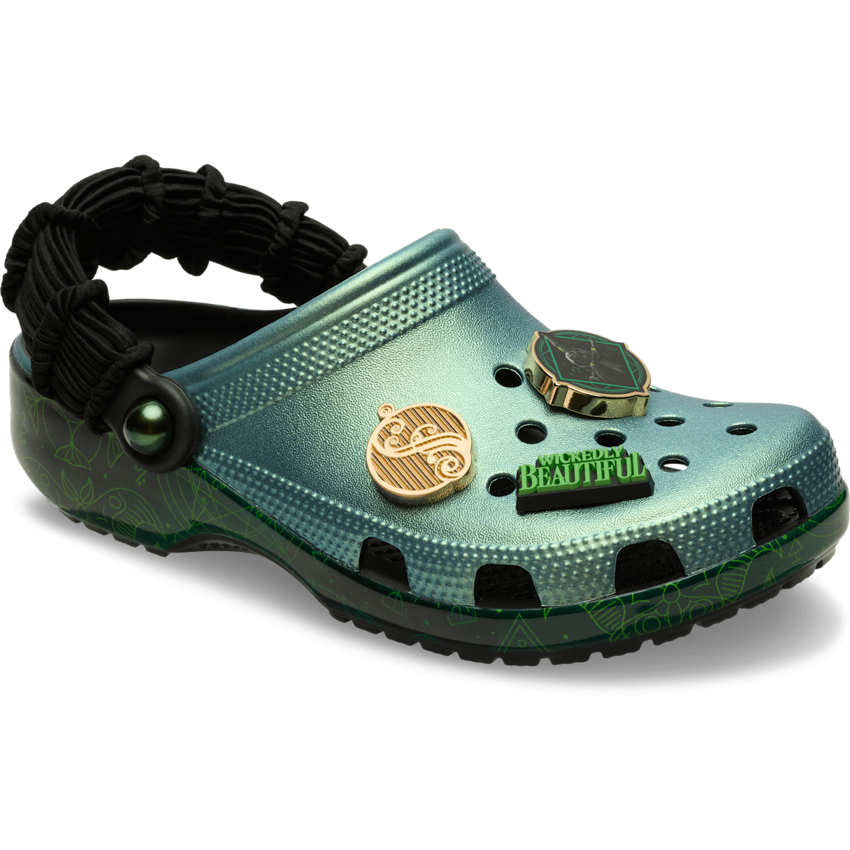 The new Wicked collection features the Elphaba Classic Clog for a style that shows you are wonderful just the way you are. This comfortable clog features a positively green metallic upper with a printed sole, complemented by a stylish costume-inspired cuff around the heel strap. The Elphaba Classic Clog includes six themed Jibbitz™ charms, including a glow-in-the-dark “Defy Gravity” charm that will have you feeling wickedly beautiful.